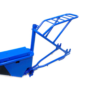 - Quadro fabricado em aço carbono com pintura eletrostática a pó, com tratamento anti-ferrugem garante um acabamento de qualidade com grande durabilidade. Possui suporte para freio à tambor ou à disco, compartimento para até quatro baterias de chumbo ácido.