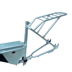 - Quadro fabricado em aço carbono com pintura eletrostática a pó, com tratamento anti-ferrugem garante um acabamento de qualidade com grande durabilidade. Possui suporte para freio à tambor ou à disco, compartimento para até quatro baterias de chumbo ácido.